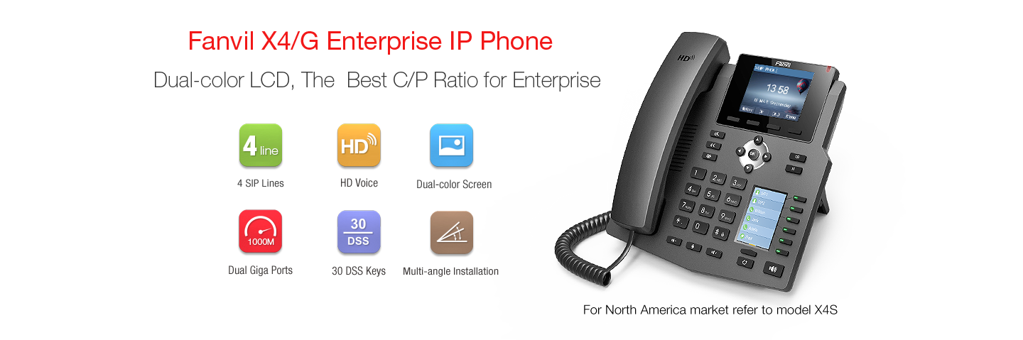 Le Fanvil X4 est un téléphone IP de bureau, entreprise, haut de gamme, avec écran Couleur LCD de 2.8" qui est livré avec une clé intelligente DSS-cartographie LCD pour augmenter la productivité des utilisateurs de l'entreprise à un prix rentable. Sans alimentation.