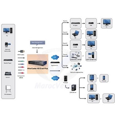 Avec sa technologie multicast sur réseau IP , AVerCaster HD Duet Plus permet d'encoder/streamer et/ou d'archiver un flux vidéo HD à partir de n'importe quelle source vidéo avec une sortie HDMI ou composante, telle que les décodeurs TV, les caméras HD ou les tableaux blancs interactifs. Il devient facile de diffuser en masse des contenus vidéo HD simultanément à un nombre illimité d'utilisateurs sur le réseau IP.