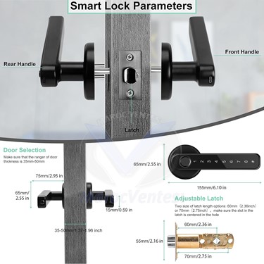 le levier de porte électronique nécessite 4 piles alcalines AAA (incluses) et répond aux normes américaines de porte, entrée 2-3/8″ (60 mm) et 2-1/8″ (70 mm), épaisseurs de porte de 1 à 3/8 » à 2-1/8 » (35mm -55mm). Les fonctions de mode passage, mode de verrouillage automatique, code PIN brouillage, avertissement de batterie faible, alimentation de secours sont tout compris.