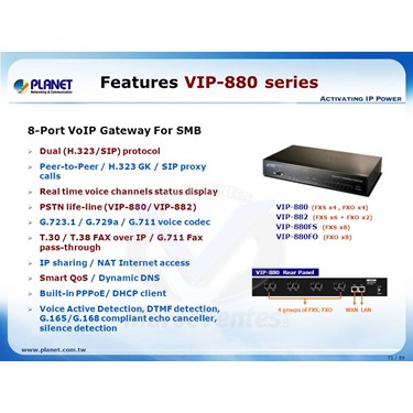 Avec des années d'expérience dans la téléphonie sur Internet et la fabrication de routeurs, PLANET est fière de présenter le tout dernier membre de la famille des passerelles VoIP PLANET: le VIP-880 / VIP-880FO / VIP-880FS / VIP-882.Les passerelles VoIP de la série PLANET VIP-880 sont des passerelles résidentielles conformes aux normes SIP et H.323 qui offrent une solution complète pour l'intégration du réseau voix-données et du réseau téléphonique public commuté (RTPC). La série VIP-880 fournit non seulement des communications vocales de qualité, mais offre également des capacités de partage Internet sécurisées et fiables pour les communications quotidiennes par voix et Internet.Grâce au processeur DSP avancé (TI) et à la technologie VoIP de pointe, la série PLANET VIP-880 est capable de gérer les appels SIP et H.323. Avec jusqu'à 8 enregistrements au proxy SIP ou au portier H.323, la série VIP-880 peut effectuer des appels vers un environnement de communication vocale H.323 ou SIP. Le VIP-880 est équipé d'un commutateur Ethernet de port LAN et d'une fonction de routeur NAT intégrée qui fournit un accès Internet en utilisant une seule adresse IP; Grâce à ces fonctionnalités, les utilisateurs peuvent désormais profiter d'appels vocaux de haute qualité et d'un accès Internet sécurisé sans interférer avec les activités de routine.En attendant, les séries PLANET VIP-880 sont conçues dans le confort et la facilité d'utilisation pour des clients. La série VIP-880 hérite non seulement des traditions de communications vocales de qualité et de données de télécopie en temps réel sur les réseaux IP, mais élimine également le besoin de ressources humaines dans le déploiement du réseau VoIP. Avec une architecture H.323 / SIP optimisée, la série PLANET VIP-880 est un choix idéal pour le chat vocal P2P et la solution économique ITSP. De plus, ils fournissent également une fonction de conversion de réseau pour traduire le réseau de paquets en système PBX traditionnel.Avec les clients PPPoE / DHCP / DDNS intégrés, jusqu'à 8 connexions simultanées peuvent être proposées dans la série VIP-880, par conséquent les communications vocales peuvent être établies partout dans le monde. La série PLANET VIP-880 est dotée d'une interface de gestion conviviale et puissante (web / telnet / console) qui permet de réduire considérablement les ressources humaines et de déployer le VoIP en peu de temps. Grâce à la fonction de gestion à distance fournie, les administrateurs VoIP peuvent surveiller l'état de la machine / du réseau, ou effectuer un service de maintenance / dépannage via un navigateur Internet ou une session Telnet. En outre, la série VIP-880 offre un affichage de l'état des canaux vocaux et une transmission optimisée de la voix par paquets sur les réseaux IP gérés et publics (Internet).Caractéristiques
